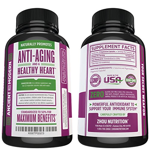 -. Binding : Health and Beauty -. Brand : Zhou Nutrition -. EAN : 0637769766030 -. Feature : HIGH POTENCY TRANS-RESVERATROL - Zhou Nutrition's Trans Resveratrol is standardized to 50% Trans-Resveratrol to maximize the natural benefits of Resveratrol. Our team of experts crafted a formula with just the right amount for maximum results. No more, no less. / FIGHT SIGNS OF AGING NOW- Resveratrol, especially when there is a high potency of trans-resveratrol, has gained recognition for its anti-aging effects. Antioxidants like resveratrol can help prevent cell damage caused by free radicals, which are believed to be the cause of aging and many other health issues. / SUPPORT YOUR IMMUNE SYSTEM- Resveratrol is a powerful flavonoid antioxidant. Resveratrol is unique because it can cross the 'blood-brain barrier' to help protect both your brain and nervous system. Several ingredients in this proprietary blend work synergistically to support immune function as well. / PROMOTE A HEALTHY HEART- Resveratrol is known for it's heart-healthy benefits. This polyphenol and flavonoid antioxidant is most commonly associated with red grape skins and, of course, red wine. It is also naturally-occurring in peanuts, Japanese knotweed (polygonum cuspidatum), blueberries and some other berries. Japanese knotweed has one of the highest resveratrol contents among natural sources. / MONEY-BACK GUARANTEE- As with all of our products, we offer a 60-DAY 100% Money Back Guarantee - return even the empty bottles! We are so confident that you will love Zhou Nutrition's Trans-Resveratrol that we'll refund every penny if you don't like it. Simply contact Zhou Nutrition directly for a full refund. What do you have to lose? -. IsAdultProduct : 0 -. Label : Zhou Nutrition -. Manufacturer : Zhou Nutrition -. PackageQuantity : 1 -. ProductGroup : Health and Beauty -. ProductTypeName : HEALTH_PERSONAL_CARE -. Publisher : Zhou Nutrition -. Studio : Zhou Nutrition -. Title : Trans Resveratrol Supplement for Maximum Anti-Aging Support, Immune System Boost & Heart Health - Standardized to 50% - Expertly-Crafted for Powerful Antioxidant Benefits - 60 Vegetarian Capsules -. UPC : 637769766030