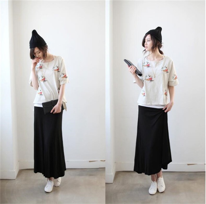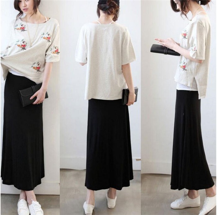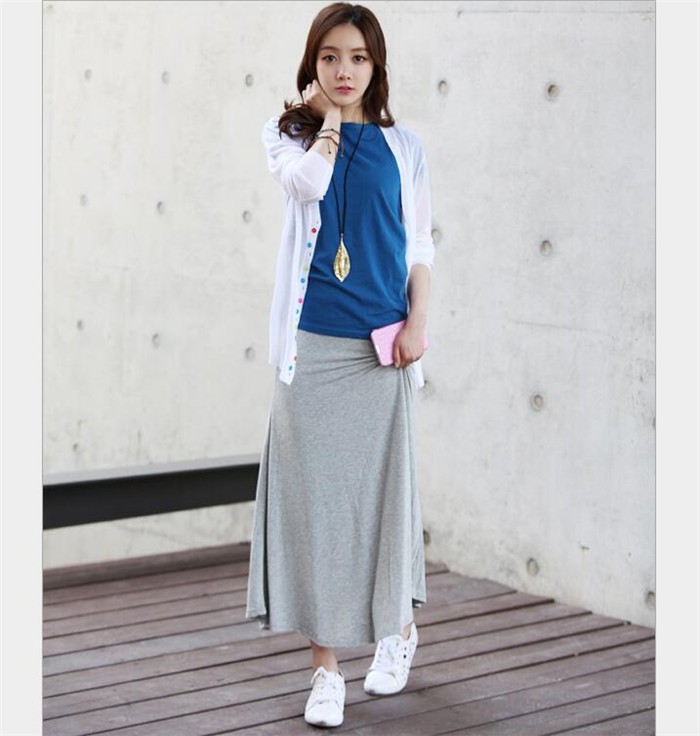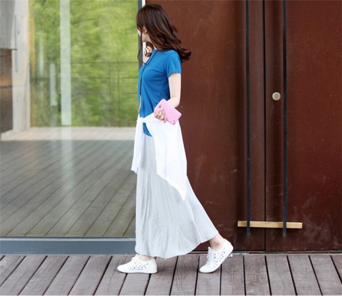 落ち感フレアで美シルエット 素肌に優しく柔らかな素材を使用。リラックスできる着心地で、ずっと着ていたくなるアイテム♪トレンドに左右されないシンプルな無地フレアスカートだからどんなコーデにも合わせやすい!!ドレープがきれいにでるので体型カバーもバッチリ!!★素材:コットン★生地の厚さ:普通 ★生産国:中国 ★カラー:黒、紺色、ダークグレー、ライトグレー(写真参考)※お客様ご使用のPC環境により商品画像のカラーが多少異なる場合があります。仕入時期により多少デザインなど異なる場合があります。ご了承ください。★サイズ(CM):フリーサイズ:着丈84 ウエスト62-92 ヒップ94 蹴回し200この商品は普段「Sサイズ」「Mサイズ」「Lサイズ」を着ている方にオススメいたします。*あくまでご参考になります。平置き実寸サイズをご確認ください。※サイズは人の手によって測っているため、1-3cmの誤差がある場合がございます。予めご了承下さいませ。