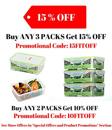 - BUY MORE => SAVE MORE: The more containers you buy, the more you save, so make sure you equip your kitchen with plenty of REUSABLE LUNCH BOXES. You and your family deserve to eat well for every meal, regardless of time constraints. They can even be used to store office and school supplies, hardware, and even pet food! USE CODE: 15FITOFF TO GET 15% OFF When You Buy ANY 3 PACKS Of Our Bento Lunch Box Meal Prep Container Packs, or USE CODE: 10FITOFF TO GET 10% When You Buy 2 PACKS.