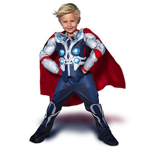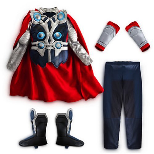 -. Binding : Toy -. Brand : Disney Interactive Studios -. Color : Blue -. Department : Boys -. Feature : AUTHENTIC DISNEY PRODUCT & QUALITY / Fully padded long sleeve tunic / Padded gauntlets with faux-suede wristlets and elastic straps / Padded boot covers with elastic straps for secure fit / Faux-suede cape with self-stick fabric clasps -. PackageQuantity : 1 -. ProductGroup : Toy -. ProductTypeName : TOYS_AND_GAMES -. Title : Disney Store the Avengers Deluxe Thor Costume for Boys Toddlers