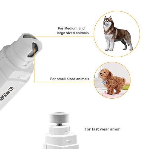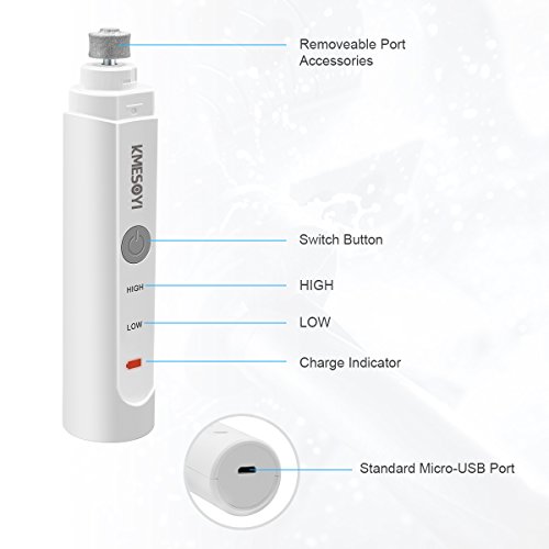 Attention ● If it is the first time for the pet to use nail grinder, it is recommended that the sharp fingernail or long wear parts should be grinded firstly, but not too much, avoid causing bleeding. ● For pet's safety, it should not be more than 5 seconds for one lasting time, and be aware to adjust the grooming angle to polish pet nails. ● Open the battery from either side is more convenient. Package include ? 1 x KMESOYI Nail Grinder ? 1 x User Manual with Nail Cutting Guide ? 1 x USB Cable