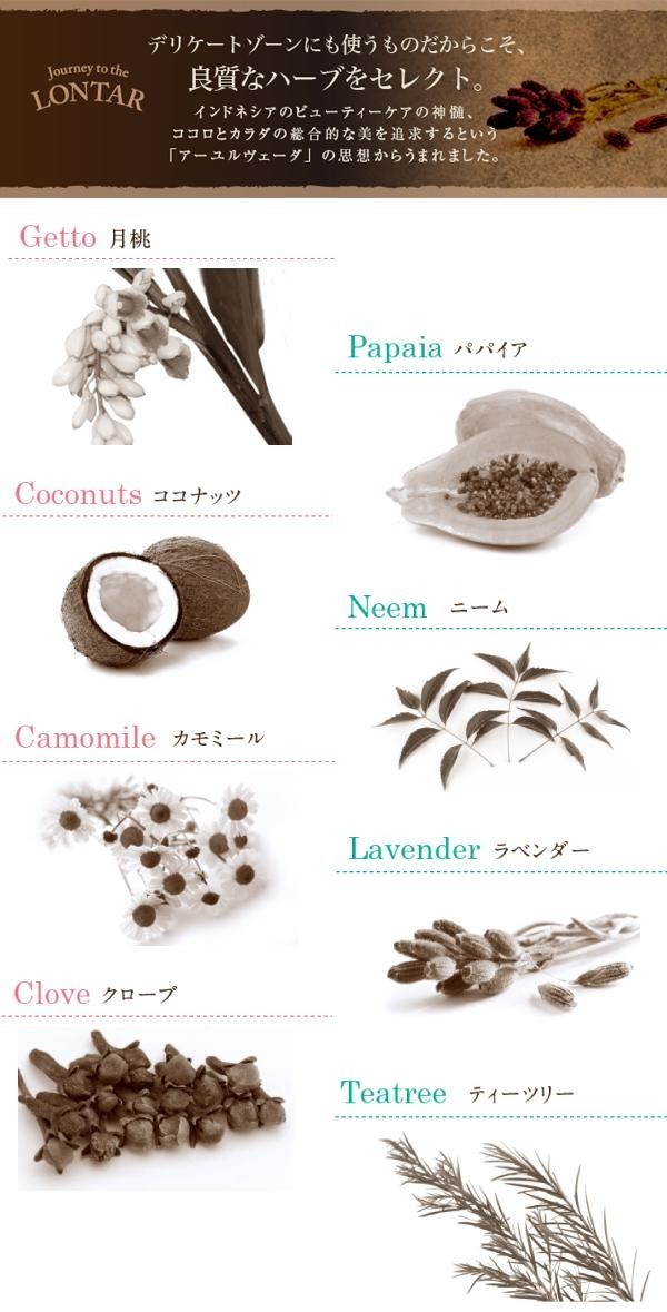 「LONTAR」は、インドネシアの女性から受け継がれてきた「ジャムウ」という処方をもとに作られたジェルソープです。お肌にやさしい弱酸性。デリケートな部分に使うものだからこそ、ノンケミカルであることにこだわりました。日本の女性のために、「LONTAR」は日本生まれ。植物も人間もやはり自然の一部なので、その土地にあるものが適しているという理念のもと、アジアのハーブに極力こだわったセレクトをしています。 |