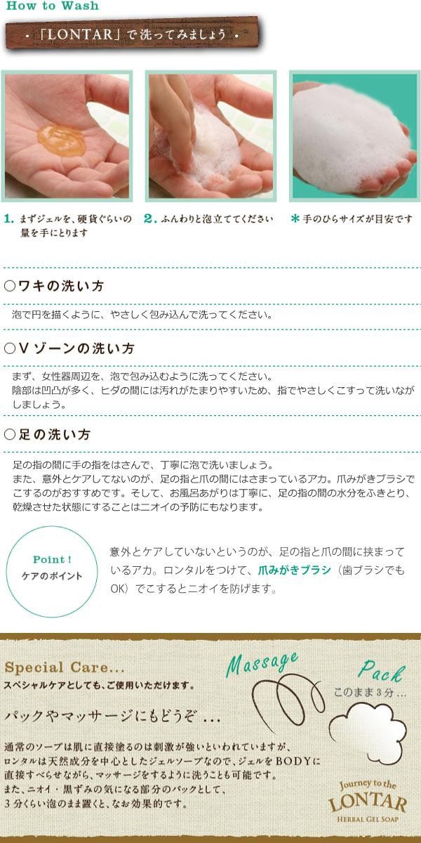 | 「LONTAR」は、インドネシアの女性から受け継がれてきた「ジャムウ」という処方をもとに作られたジェルソープです。お肌にやさしい弱酸性。デリケートな部分に使うものだからこそ、ノンケミカルであることにこだわりました。日本の女性のために、「LONTAR」は日本生まれ。植物も人間もやはり自然の一部なので、その土地にあるものが適しているという理念のもと、アジアのハーブに極力こだわったセレクトをしています。 |