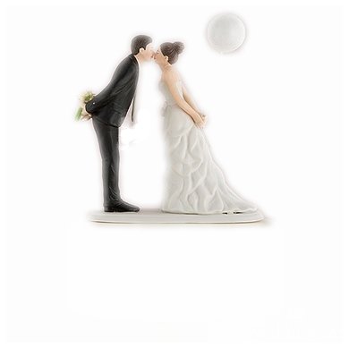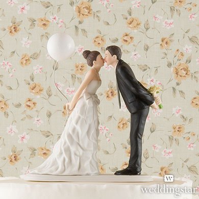 Studio : Weddingstar Publisher : Weddingstar Binding : Kitchen Product Description This couple is sweetly leaning forward for a kiss as husband and wife! Wearing a beautiful bowed dress and clasping a balloon, this beautiful bride is leaning towards her one true love as he holds onto her bouquet. This cake topper is 5.125" x 2.375" x 5.5". 0
