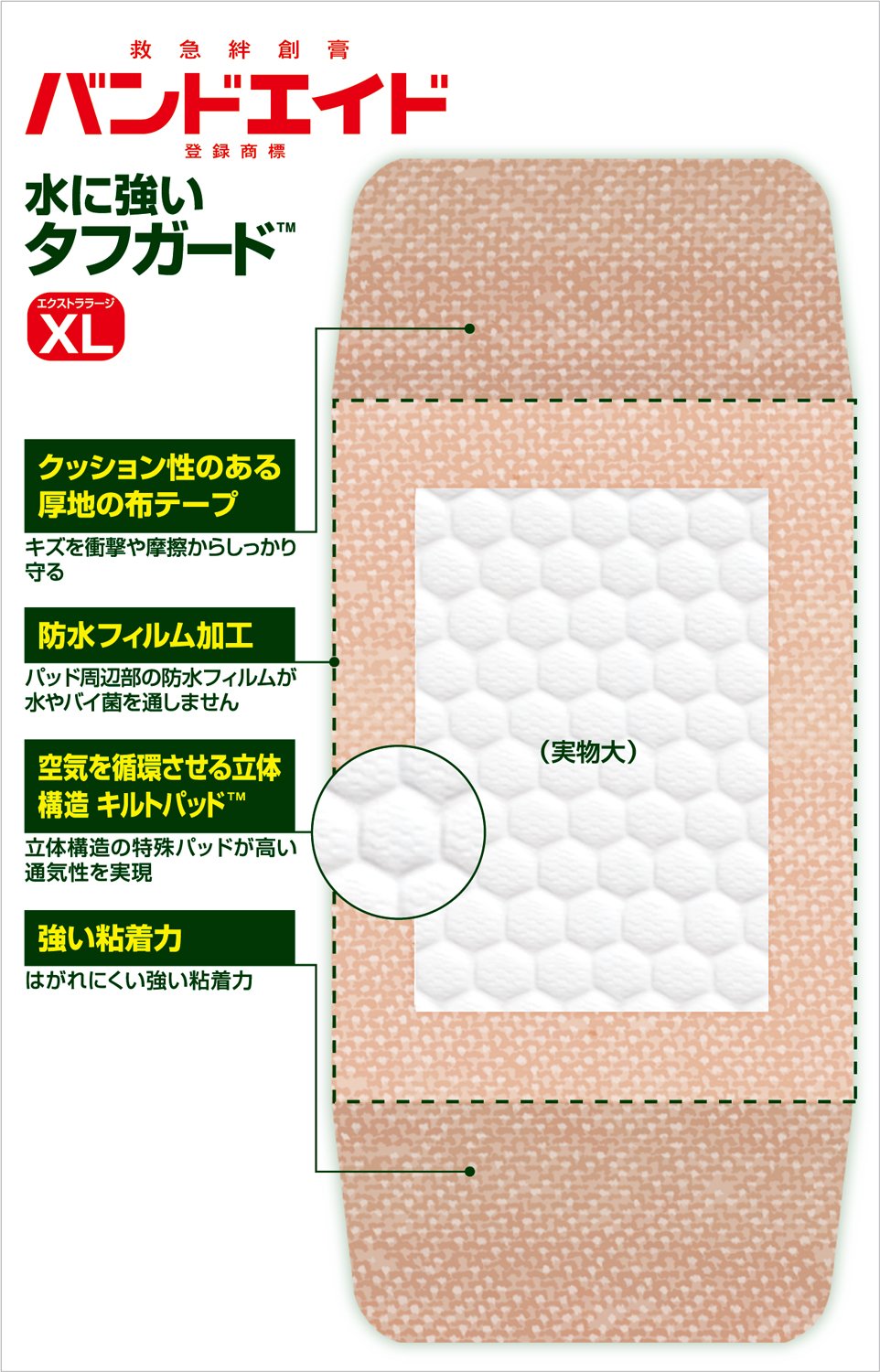 "Tough guard XL 10 strong with Band-Aid water" is a waterproof adhesive bandage with adhesive strength that can withstand hard situations such as long-time water work.