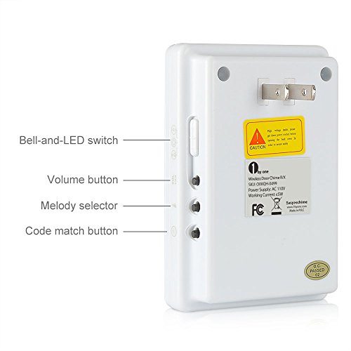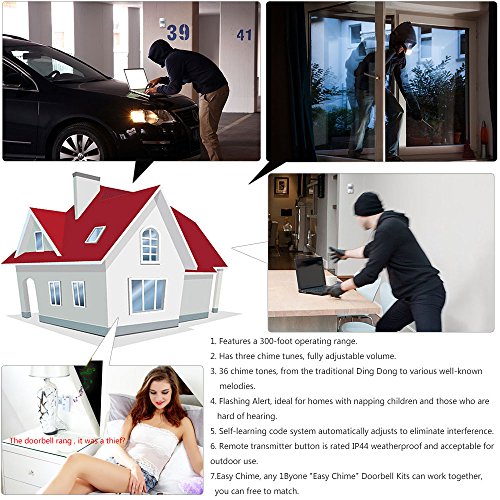 - Feature : Note: Includes 1 plug in receiver unit and 2 motion sensor, it perfectly combines the function of driveway alert with doorbell. Any 1byone "Easy Chime" Driveway Alert Doorbell Kits can work together, if you need additional sensor, please purchase O00QH-0513. / When the PIR detects the moving heat from car engines or human beings, the transmitter would be activated and send a wireless signal to the Receiver. The Receiver would sound. The sound will stop when the melody ends. / Easy to install and requires no wiring. Receiver easily plugs into an electrical outlet (no batteries required). Operating range of over 300 feet (between sensor and main chime unit). / Can be used as a simple alert unit instead of investing in costly security systems! Detecting and alerting when someone approaches a front door! Alert when a customer walks through the front door of a store or office! Alerting when a car approaches a driveway, and many more! / Powerful 120-decibel alarm sounds off when motion is detected within a 20-foot range. Unique security code between chime and sensor - avoid interference with neighbour's chimes. Blue LED Light, volume adjustment (upto 3 levels),36 Melodies Tunes To Choose,