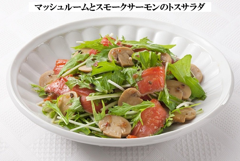 (2) Place (1), 8 smoked salmon, 1 bag of mushy mushrooms in the bowl, add a cheap tasty dressing Japanese style flavored onion dressing and sprinkle it in an appropriate amount.