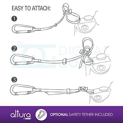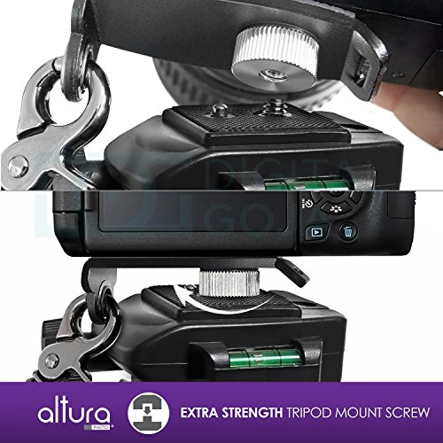 - Features a lightweight strap with a reinforced metal sizing adjustable buckle on the front for quick adjustments and a metal screw-in plate attaching to the strap and the bottom of the camera tripod socket.