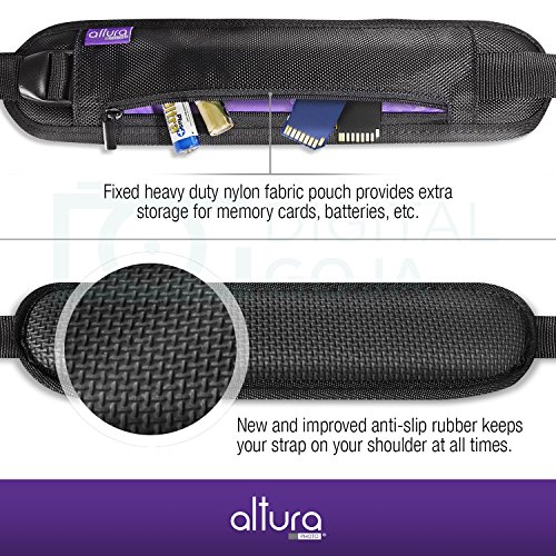 LIGHT AND COMFORTABLE: Neoprene pad distributes weight perfectly, with comfortable design shaped to fit perfectly around shoulder for constant use and travel. Even includes a zipper pocket for storing extra batteries, memory cards, etc.