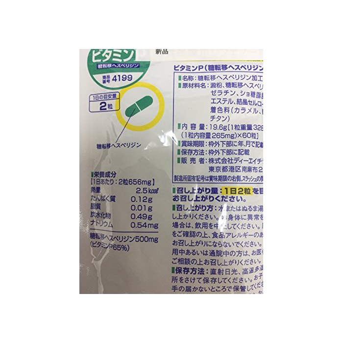 비타민P(당전이《헤스페리진》)1일(날)2 입기준656mg(내용량530mg)근처,당전이《헤스페리진》(비타민P65%)500mg【주요 원재료】당전이《헤스페리진》【조정 제등】콘 스타《지》,《쇼》당 지방산 에스테르,결정 셀룰로오스【피포제】젤라틴,착색료(카라멜,산화 티타늄(티탄))