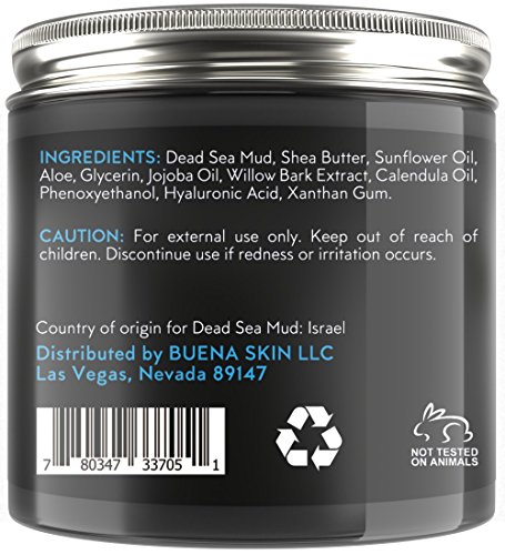 ►MUD MASK - Buena Skin's Dead Sea Mineral Mask Infused With Hyaluronic Acid has a high mineral content you won't find in any other mud across the world. Contains calcium, chloride, bromide, magnesium and more.