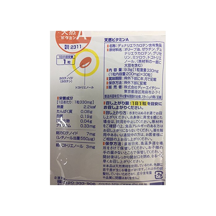 천연 비타민A1일(날)1 입총중량330mg(내용량200mg)근처총 카로《데노이도》 7mg(《레치노루》당 양550μg)고, 총토코 새《에노루》 3mg 【주요 원재료】 데《나리에라카로텐》,토코 새《에노루》 【조정 제등】 올리브유,《미츠로우》 【피포제】 젤라틴,글리세린(원재료의 일부에 대두를 포함한다)