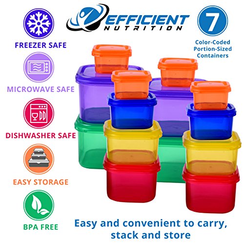 Studio : Efficient Nutrition Publisher : Efficient Nutrition Product Description It's time to lose weight with Efficient Nutrition! Feel amazing by choosing our healthy diet plan featuring our 14-piece portion control container set! Our food storage meal prep set system is designed with 14 food containers (and matching lids) color-coded to show you exactly how much of each basic food group you need each day. This way you're not only getting the perfect healthy portion of food, you're also putting the right foods in your body. Also included is our 21 Day Meal Planner with Printable Daily Tracker to stay organize and efficient, printable Grocery List and our Simple and Delicious Recipes ebook, delivered via email after purchase. Here are just a few of the benefits of our 14-piece meal container set: 1) Our Portion Control Kit comes with a Complete Guide providing an extensive list of foods for each container and program for every level of fitness. 2) BPA FREE Food-Grade Plastic 3) Microwave, Freezer and Dishwasher Safe 4) Saves Time, Money and Effort 5) Reusable and Easy to Clean 6) Color Coded for Easy Use Click nAdd to Carti to start your simple weight loss journey! 0