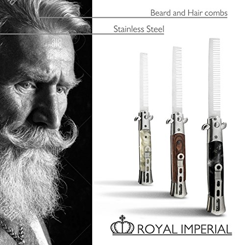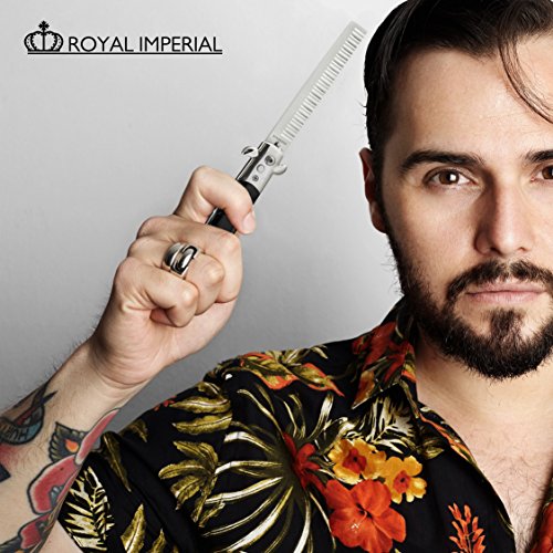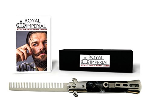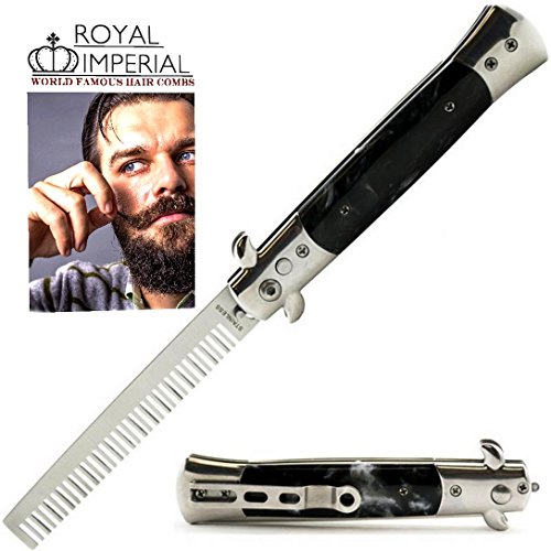 BUY THE ORIGINAL PUSH-BUTTON SWITCHBLADE COMB: Only Royal Imperial offers a superior push-button spring action design. The locking mechanism and durability will ensure the long life of your comb. Beware of cheaper combs on Amazon. Our enhanced spring mechanism and locking mechanism is built to last! The smooth shine of the polished handle and the overall classic design adds to the coolness factor. INCLUDES Beard Fact Wallet Booklet.