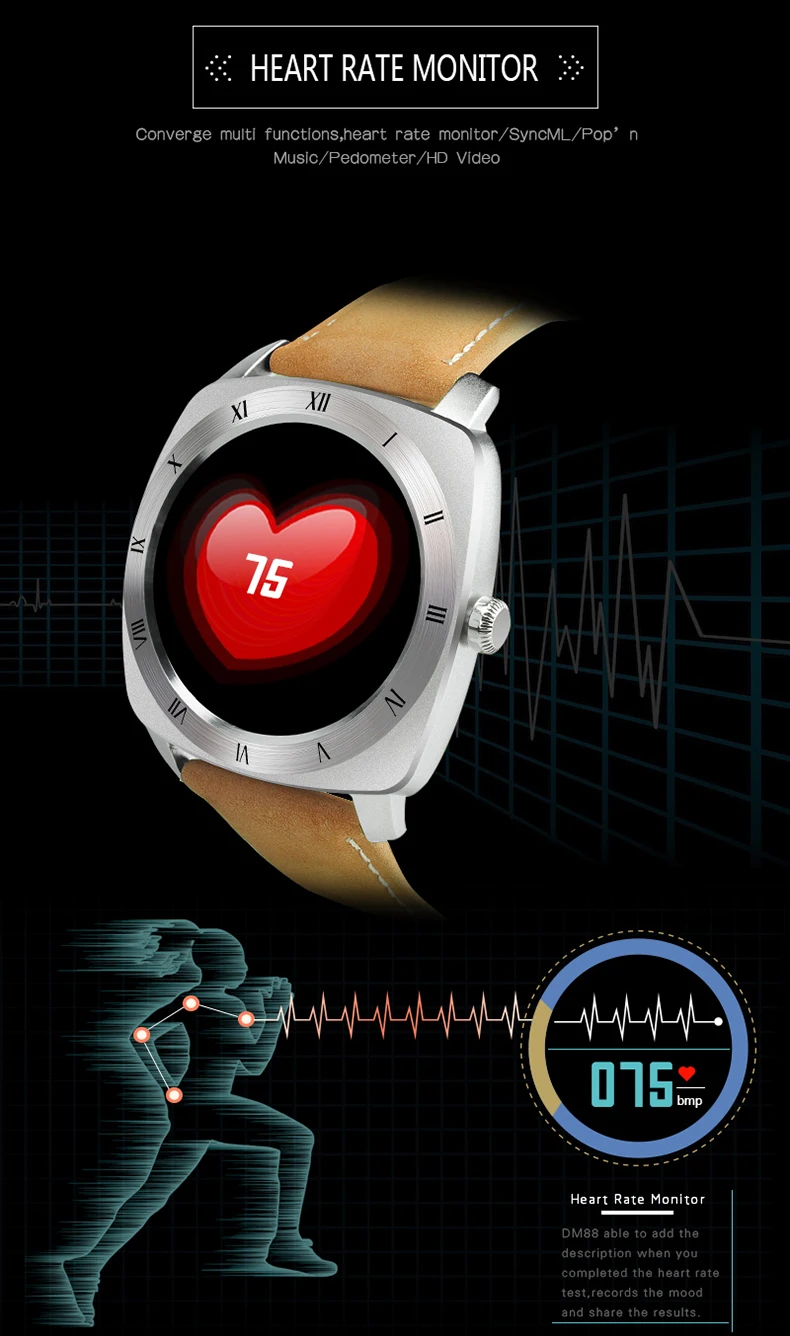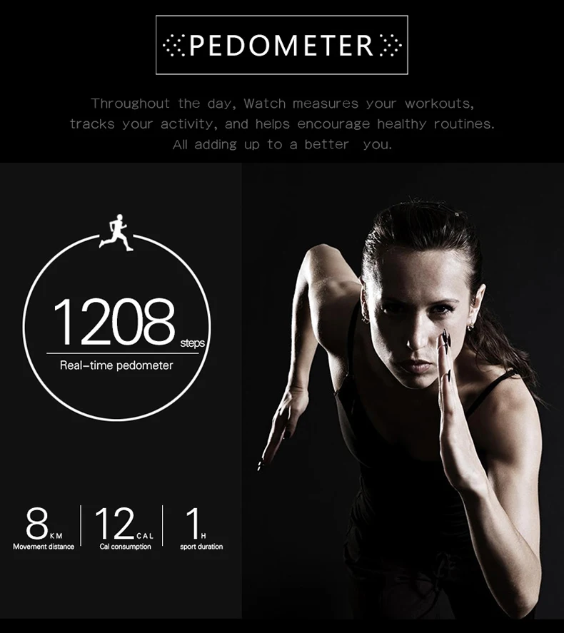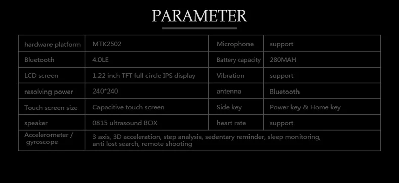 Function:Week,24 hour instruction,Answer Call,Passometer,Alarm Clock,Call Reminder,Month,Calendar,Remote Control,Sleep Tracker,Heart Rate Tracker,Push Message