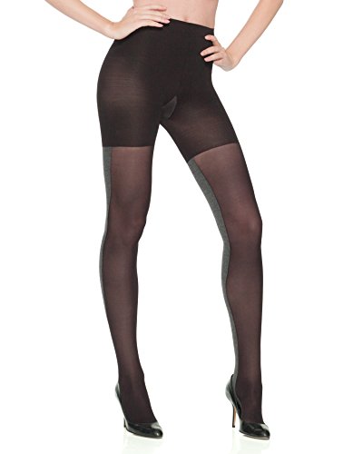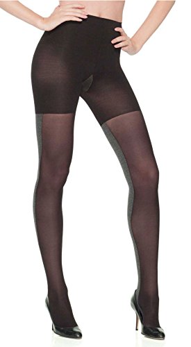 SPANX Tight-End-Tights Heathered Contrast with comfortable shaping and reversible wear makes these Heathered tights the new it look. Product Features: Shaping tights Heather is the new it look! Reversible wear- from solid to heathered Solid Side: semi-sheer Heathered side: matte opaque Seamed toes Non-binding waist band 1.25 wide stretch waistband 8 Front and back seams Comfortably slims the tummy, hips, thighs, and rear Panties are optional, eliminating VPL (visible panty lines) 81% nylon, 11% elastane/lycra, 8% polyester 100% cotton gussetFeature