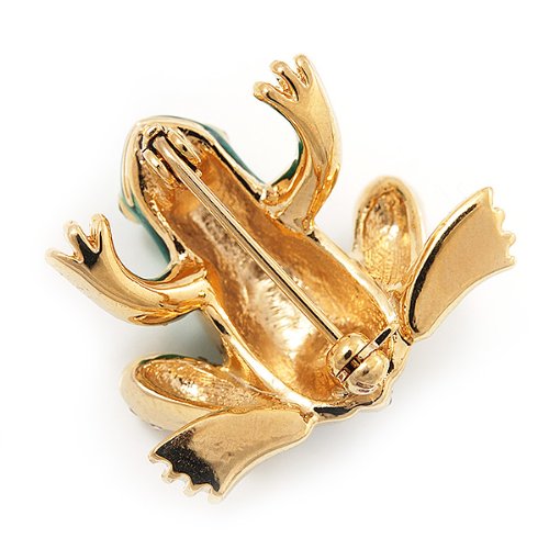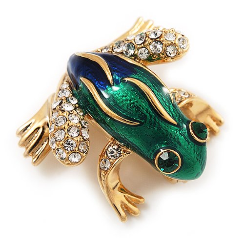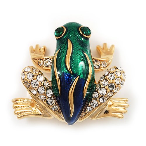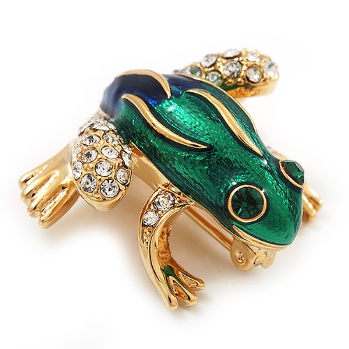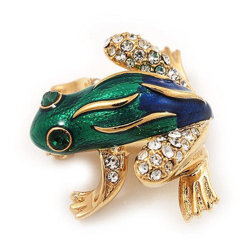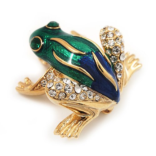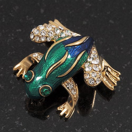 -. Title : Funky Green/Blue Enamel Swarovski Crystal 'Frog' Brooch In Gold Plated Metal - 2.5cm Length