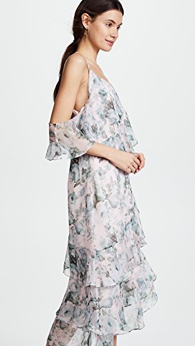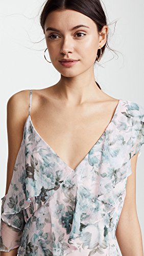 One shoulder is covered by tiered ruffles and the other is bare