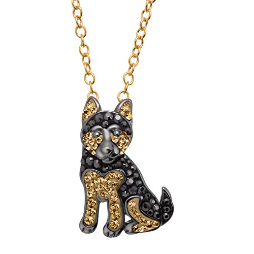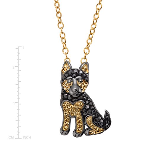 Salute man's best friend with this playful piece! Crafted in black rhodium-plated sterling silver, this German Shepherd pendant features round-cut black and light brown Swarovski crystals to give your neckline an unexpected glow. Piece measures 7/8 by 5/8 inches. Comes with a 14K gold-plated sterling silver 18-inch cable chain with a lobster clasp.Feature