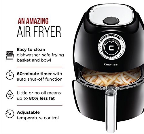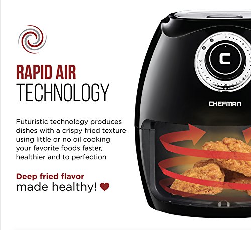 FRY WITH AIR NOT OIL: Chefman's Oil Free Air Fryer with rapid air technology will give you crisp and even results in minutes. Finally make fried foods that taste amazing but are healthy instead of artery clogging.