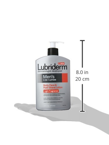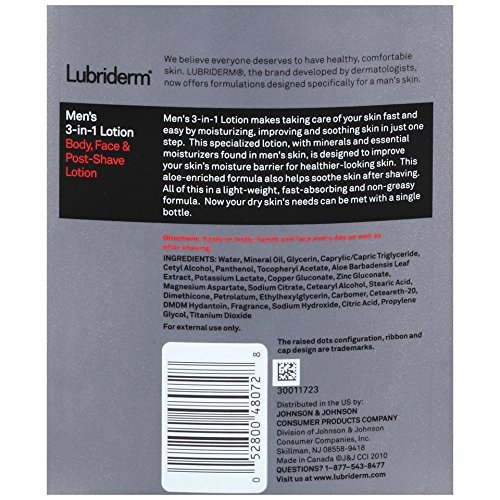 Lubriderm Men's 3-in-1 Lotion with Light Fragrance helps moisturize, soothe, and improve the healthy look of skin in just one step. From a dermatologist-developed brand, this lotion is specially formulated for men’s skin care needs and it can be used as a body, face, and soothing post-shave moisturizer. Its aloe-enriched formula contains minerals and essential moisturizers for healthier-looking skin. Lubriderm Men's 3-in-1 Lotion is lightweight, fast-absorbing, and non-greasy with a fresh, clean fragrance.Feature