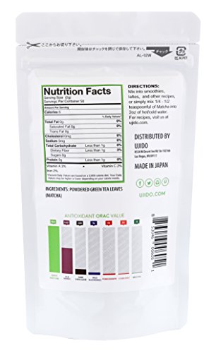 -. Binding : Grocery -. Brand : Ujido -. Feature : 180 years in producing matcha by environmental traditional way / Authentic covered tea garden for highest nutrition / Choice of the imperial families and Zen Buddhist monks for Generations / High quality control and low bacteria count / Tea leaves are 100% genuinely hand picked -. IsAdultProduct : 0 -. Label : Itohkyuemon North America Inc -. Manufacturer : Itohkyuemon North America Inc -. ProductGroup : Grocery -. ProductTypeName : GROCERY -. Publisher : Itohkyuemon North America Inc -. Studio : Itohkyuemon North America Inc -. Title : Ujido - Matcha, Green Tea Powder - Natural Energy and Focus Booster - Culinary Grade - The Path of Zen, the Ultimate Superfood- Gluten Free and Vegan - 4oz
