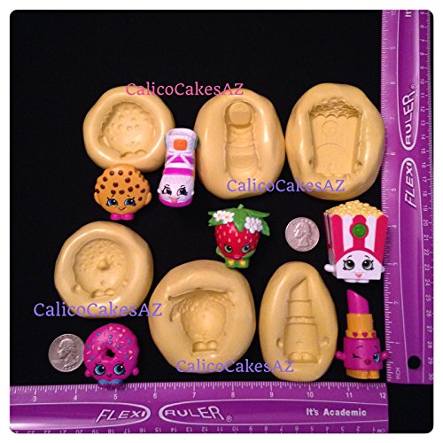 -. Title : 6 Shopkins Fondant Mold Set Chocolate Soap Resin Clay Kooky Cookie D'Lish Donut Lippy Lips Strawberry Kiss Sneaky Wedge Poppy Corn
