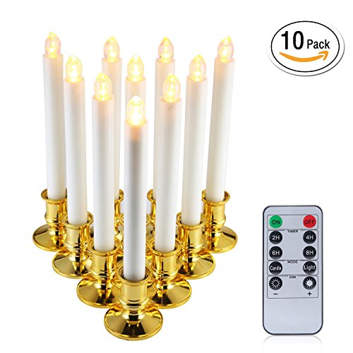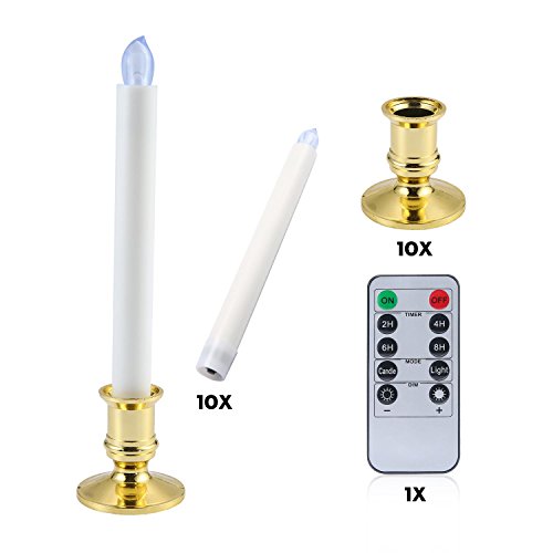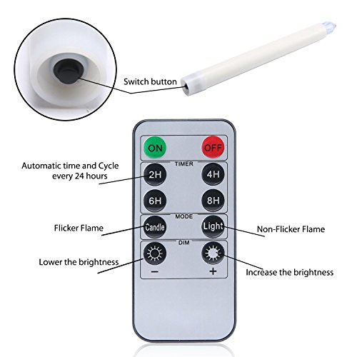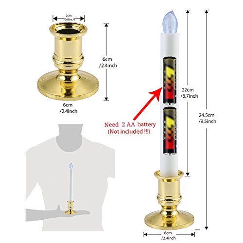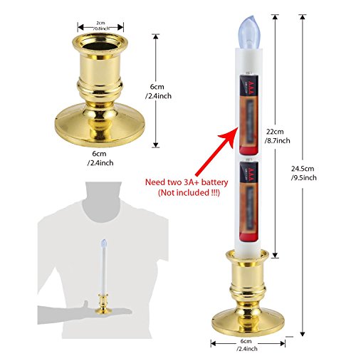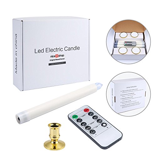 Studio : niceEshop Publisher : niceEshop Binding : Kitchen Product Description Appearance features: white candle body and golden candle base, look noble and elegant, the realistic led candle shape looks like real candle:height 24.5cm base diameter 6cm candle 2cm base height 6cm(In addition to the base) Remote control with timing function; 2 H. 4H. 6H. 8H. (24-2h, 24-4h, 24-6h. 24-8h) Lighting mode supports flash mode (candle) and long Light mode (Light). Light supports brightness adjustment Each candle needs to be equipped with two AA and 1.5V batteries(not include!) The remote control distance is about 3-5m.