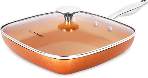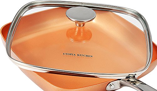 Includes square copper frying pan measuring 9.5 inches in length with stainless steel handle and 4 mm thick glass lid