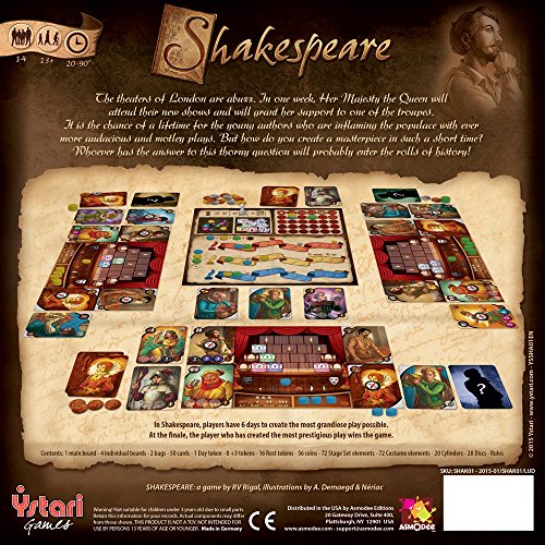 -. Feature : Beautiful art and components work perfectly with the theme / Different ways to play, including a solo variant / Cast actors in Shakespeare's most iconic roles