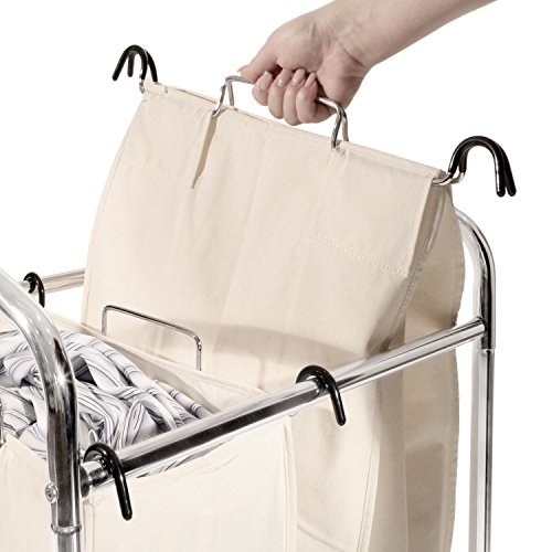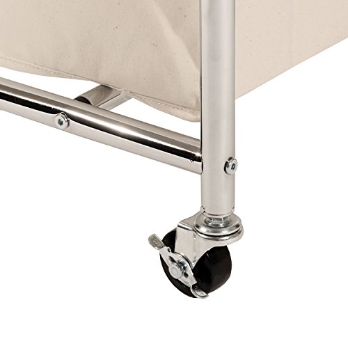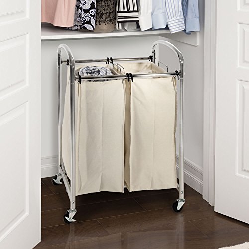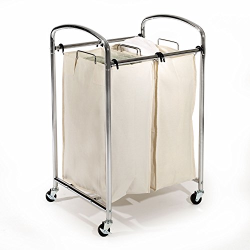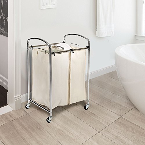 Keep your lights, darks, delicates, and linens organized with the Seville Classics Double Bag Laundry Hamper Sorter Cart. Designed with convenience in mind, the cart includes two removable and machine-washable cotton-polyester canvas bags measuring 2 cu. ft. and capable of holding up to 10 lbs. each. The heavy-duty, steel frame features base support bars that prevent full bags from sagging and wheels that lock in place when you need it to stay still. Chrome finish is easy to wipe clean with soap and water. Use it your way: organize colors and whites easily in your bedroom or laundry room; store it in a closet to keep dirty clothes out of sight; roll it from room-to-room when it's time to gather sheets and blankets; carry the bags to the laundry mat or dry cleaners.