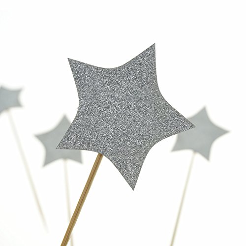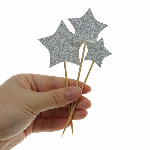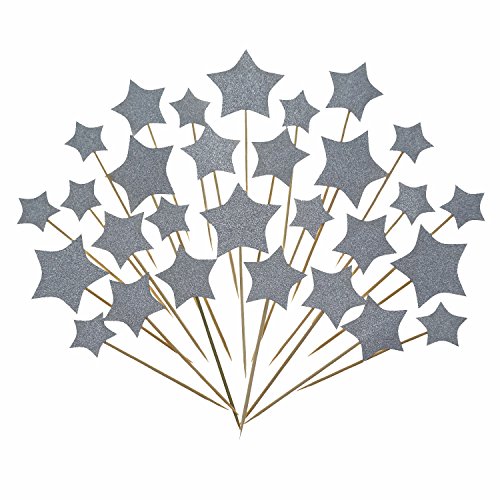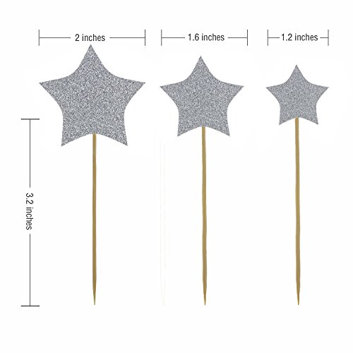 Product details: Silver stars diameter of 3 different sizes, respectively as 2 inches (5 cm), 1.6 inches (4 cm), 1.2 inches (3 cm), bamboo picks length about 3.2 inches (8 cm), a total of 30 counts.