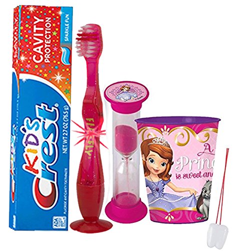 -. Feature : Turn something your kids have to do into something they want to do with the help Princess Sofia .Because when brushing is fun, it gets done! / (1) Firefly Youth Flashing Lights Suction Cup Toothbrush (Assorted Colors) (1) Kids Crest Cavity Protection Sparkle Fun Toothpaste, 2.7 oz / (1) Princess Sofia 16oz Plastic Mouthwash Rinse Cup, Doubles As Toothbrush Holder! / (1) Dentist Recommended 2 Minute Princess Sofia Themed Brushing Timer (Assorted Styles) / Plus Bonus "Remember to Brush" Visual Aid Tooth Saver Necklace. Hang it in their bathroom or by their bed so they remember to keep their chompers sparkly fresh. You could also use these tooth charms to save one of your child's baby teeth.
