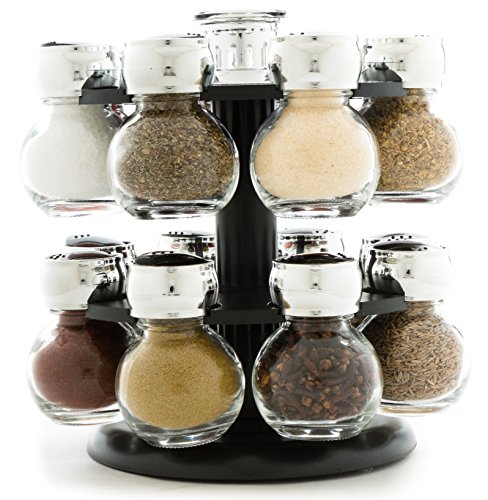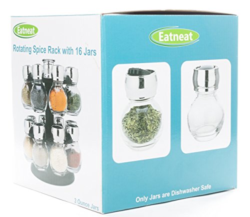 Studio : EATNEAT Publisher : EATNEAT Product Description Eatneat 16-Jar Elegant Spinning Spice Rack is an attractive way to keep your favorite spices close at hand while saving critical counter space. With a compact design you can neatly and easily store your spices in kitchen cabinets. The lids on the glass jars feature both the sift and pour options allowing the chef to work at whichever pace they prefer. The Smooth spinning action and tiered Lazy Susan carousel design allow the chef to easily identify the contents before they pour on the flavor. 0
