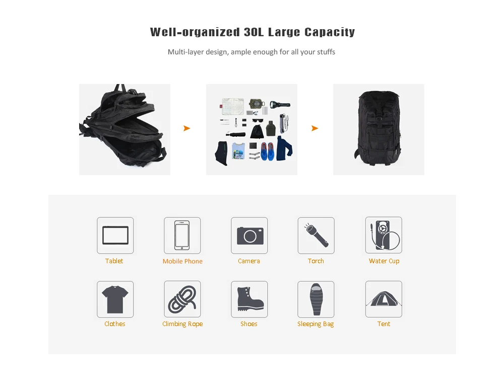 Package Contents:1 x 3P Military 30L Backpack Sports Bag for Camping Traveling Hiking Trekking