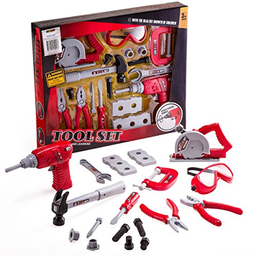 -. Feature : 17-PIECE SET. Realistic looking tools will keep the little ones engaged in pretend play for hours. Containing 17 pieces, your son or daughter can play with the hammer and nail, drill, circular saw, screwdriver, pliers, wrench, multiple nuts and bolts, a nail and realistic boards. / STURDY CONSTRUCTION. This tool set is constructed out of solid plastic for strength and easy maintenance. The material can be cleaned with soap and water if needed, so the set always looks like it just came out of the box. / REALISTIC PRETEND PLAY. Kids love to imitate their parents. This set inspires kids to be creative and role play - an important part of their development - as they copy mom or dad by fixing things around the house with their own tool set. / MULTIPLE FUNCTIONS. Boys and girls can hammer a nail or drill, screw in and loosen nuts and bolts on the realistic board. They can also use goggles to protect their eyes when using the circular saw or use the c-clamp to hold the board in place. / INTELLECTUAL DEVELOPMENT. Ideal for children ages 12 months and up, this set helps children develop eye-hand coordination. Inspiring imagination and role play, it makes a great birthday or holiday gift for both boys and girls.