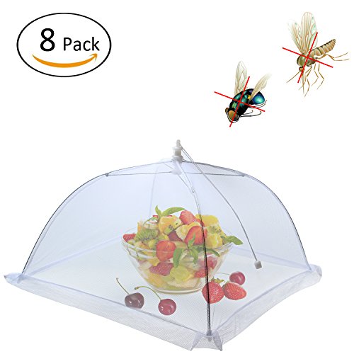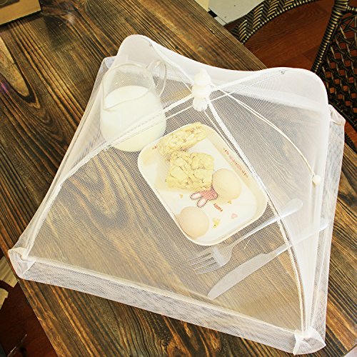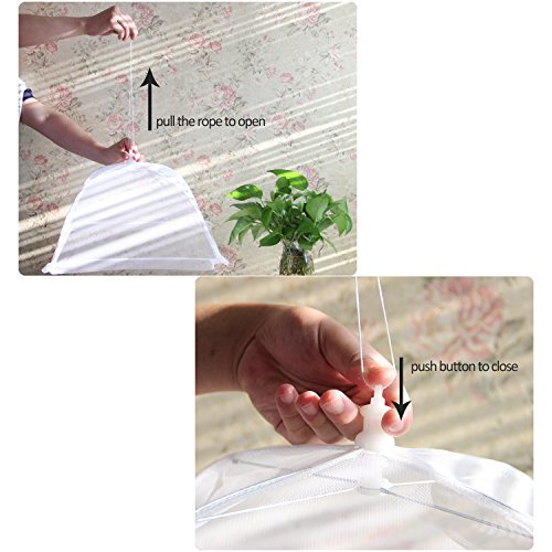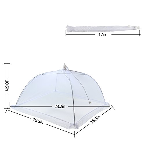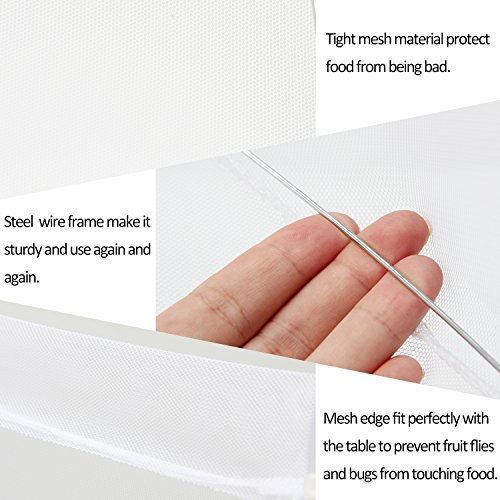 Food cover is large enough to cover food, friut and place setting. Can effectively prevent flies and insects from touching food, and going bad. It is easy to open and close. Collapsible food tent umbrella make it convenient to store. It is made of sturdy net material, can be washable and reused.