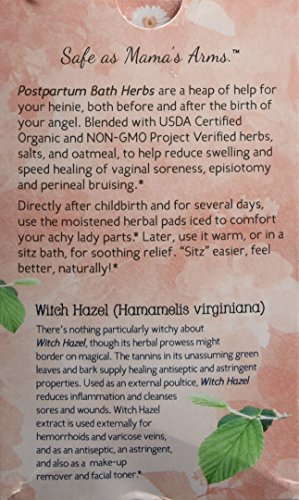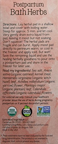 ReleaseDate : 2016-01-20 Studio : Earth Mama Angel Baby Publisher : Earth Mama Angel Baby Binding : Health and Beauty Product Description Postpartum Bath Herbs pads contain a soothing, comforting blend of wound healing, styptic and antibacterial herbs that have traditionally been used to support postpartum women for swelling and vaginal soreness, tears, episiotomy and perineal bruising. Great for prenatal and postpartum hemorrhoids too. Packed in easy to use, individual herbal pads, each is perfect for one use. Directly after childbirth and for several days, use the moistened herbal pads iced to comfort achy mama parts. Later, use them warm, or in a sits bath, for soothing relief. Toxin free, rated 0 for toxins on EWG's Skin Deep Cosmetic Database. Made without synthetic fragrance, phthalates or parabens and no petroleum products, mineral oil, Vitamin E or dyes. Formulated by a Nurse and Herbalist, naturally vegan and gluten-free. USDA Certified 100% Organic by Oregon Tilth, Non-GMO Project Verified. Made in the USA. Earth Mama Angel Baby's safe, hospital recommended, Certified Organic, Non-GMO Project Verified and natural herbal produLegal disclaimer: These statements have not been evaluated by the Food and Drug Administration. This product is not intended to diagnose, treat, cure or prevent any disease. cts and teas are specifically formulated to support the entire journey of childbirth, from Pregnancy through Postpartum Recovery, Breastfeeding, and Baby care. Safely nurturing mamas and babies for over a decade. Earth Mama, Safe as Mama's Arms. 0