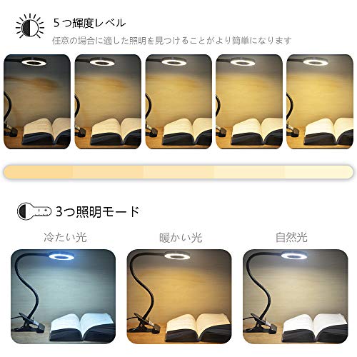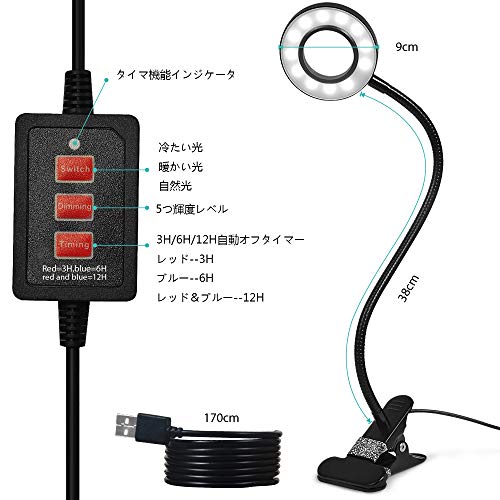 ●パワー:12W ●三つ照明モード:冷たい光、暖かい光、自然光 ●本体重量:約480g ●調光:5段階 ●コード長(m):約1.7m(ON/OFFスイッチを含む) ●設計寿命:>50000時間 ●材質:アルミニウム、鉄、プラスチック | 省エネ・目に優しい 光源は高品質・高輝度のLEDチップを採用して、しっかり明るくかつ省エネーです。発光面の広いLED光源は目に優しくて読書、勉強、PC作業など細かい作業にも大活躍です。LEDライトは50000時間使用でき、ライト交換などの悩みも解消! | ご注意 アダプターが付いていませんので、ご注意してください。十分な電力を提供するため、出力電流が2.0A以上のアダプターを利用ください。安全使用するため、輸出電圧が5V以下のアダプターを使用してくださいね。(アダプターの輸出電圧≤5Vが必要です) |