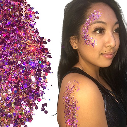 -. Binding : Apparel -. Brand : Rave Wonderland -. Color : Purple -. Department : womens -. Feature : 15 Gram Pot of Holographic Chunky Gold Glitter. / 3x more than most sellers. / Multiple sizes of iridescent and holographic purple and pink glitter. / Perfect for raves, festivals, and special occassions. / Easy to apply. Use hair gel or glitter P.R.Imer to apply onto skin or hair. -. Model : GT001PURPLE -. PackageQuantity : 1 -. ProductGroup : Apparel -. ProductTypeName : ACCESSORY -. Title : Purple Pink Holographic Chunky Glitter Large 15G Comestic Glitter Festival Rave Face Body Hair Nails