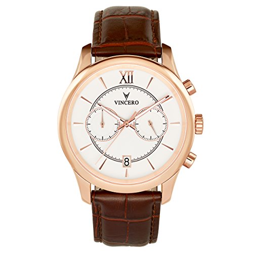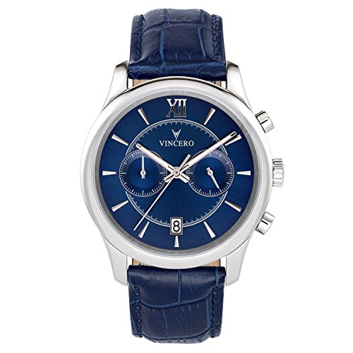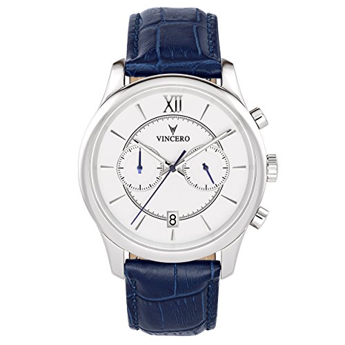 We created Vincero because we were tired of the cookie cutter designs and mass produced minimalist watches that have flooded the market. We believe a watch does so much more than tell time - it tells the world what you're all about. So we set out to re-invent the industry with a mission based on a few, core values: Quality is the most important thing; Always create gear that is bold and uncompromising; Consistently deliver products at a fair price. The Bellwether White + Silver is a bold, modern watch design punctuated by three chronograph subdials, 316L stainless steel casing and luminous hands. The Bellwether White + Silver watch is scratch and water resistant and also comes with an Italian genuine leather band. This timepiece has a silver casing, white dial and blue leather band.Feature