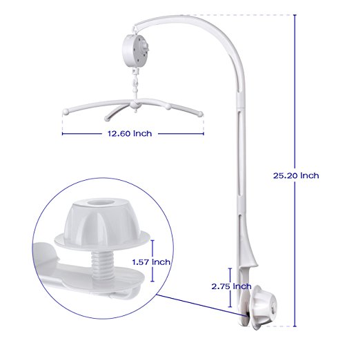 Clip crib rail thickness up to 1.57 inch, Clip crib rail height up to 2.75 inch. Hook Rotates while playing music, you can pause while playing.