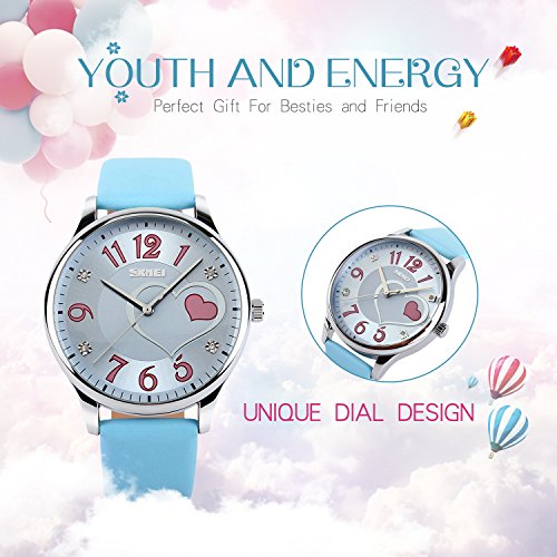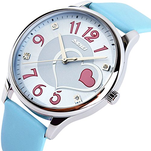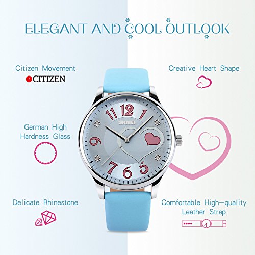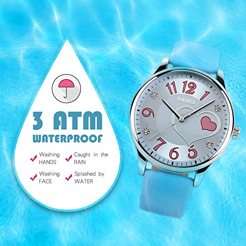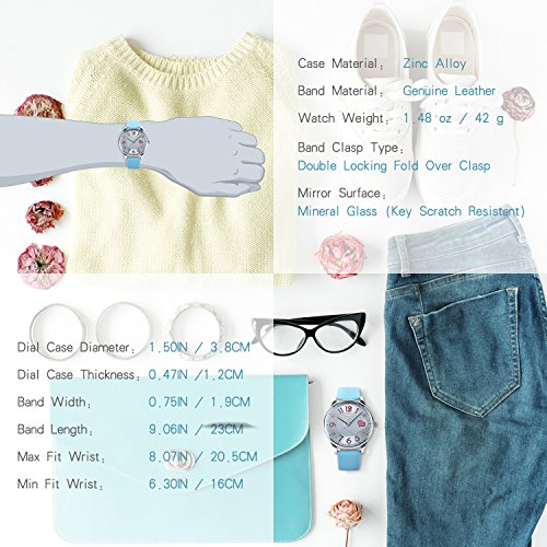 "Highlights: • Special Dial Design with Hearts, Rhinestones and Cute Arabic Numerals On It • Imported Quartz Movement provides precise and accurate time keeping • Key Scratch Resistant Watch Face • Comfortable Leather Band Strap • Stainless Steel Durable Waterproof Case Cover, Not Easy To Fade • 98FT / 30M Water Resistant - Daily Use Waterproof, Hand Wash, Rain Day, Sweating. (Please DONOT PULL OUT the button under water) • Classic Fashion Casual Dress Watch Design. Combines Quality, Leading Edge Fashion, and Value • Great and Romantic Gift for Your Friends Features • Key Scratch Resistant Watch Face • 98FT / 30M Waterproof • Leather Band Strap Material: • Case Material: Stainless Steel • Band Material: Leather • Mirror Surface: Mineral Glass (Key Scratch Resistant) Specification: • Dial Case Diameter: 1.50 inch / 3.8 cm • Dial Case Thickness: 0.47 inch / 1.2 cm • Band Color: Blue • Band Width: 0.75 inch / 1.9 cm • Band Length: 9.06 inch / 23 cm • Max Fit Wrist: 8.07 inch / 20.5 cm • Min Fit Wrist: 6.30 inch / 16 cm • Band Clasp Type: Double Locking Fold Over Clasp • Watch Weight: 1.41 oz / 40 g **NOTE**: • Please DONOT PULL OUT the Button Underwater. Use in extreme Hot or Cold temperature will damage the leather band and shorter watch life. • If mist or droplets found inside watch surface, please contact manufacturer immediately. • Clean the strap by a soft cloth on regular bases is highly recommended. • Too much water contact will damage the leather band and shorter watch life. What Is In The Package: • Women Leather Band Fashion Casual Dress Watch x 1Feature