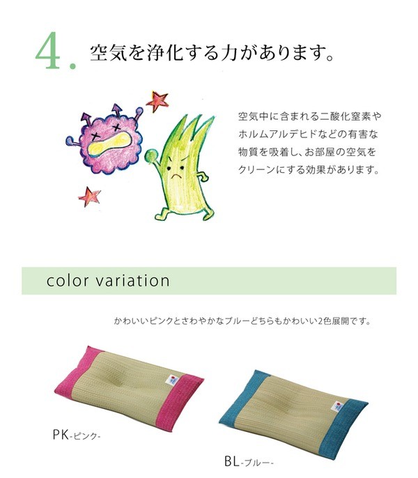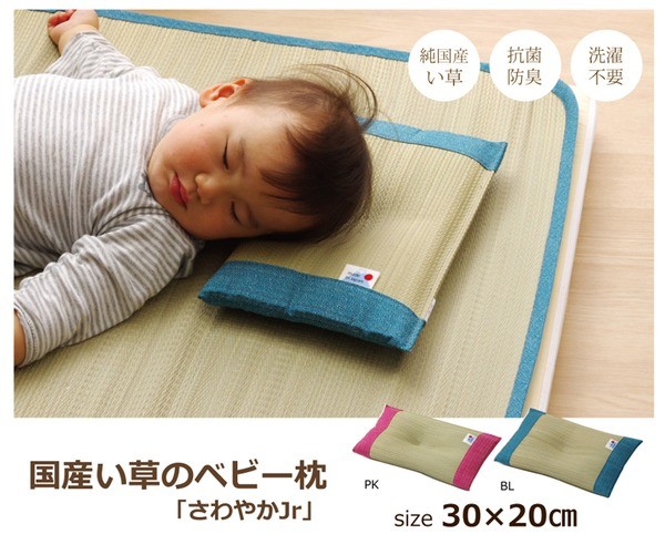 国産のイ草を使用したベビー、キッズサイズのイ草枕です。保育園のお昼寝用としてもおススメです。快眠い草の効能として1.綿の約2.5倍の吸湿力 2.蒸れにくい。汗による湿気を吸うことにより温度を下げ快適な就寝を促します。 3.汗のにおいを軽減。汗のにおいの元となる化学物質を90%以上抑えます。などがあります。国産(九州産)のしなやかなイ草を使用していますので、柔らかく、すべすべしたとした肌触りです。い草の表面に天然青森ヒバ加工を施しています(抗菌・防臭効果)。青森県のヒバの木から抽出した「ヒバ油」をメーカー独自の技術で材料や商品に加工しました。「ヒバ油」には、ヒノキチオールという天然物質としては極めて抗菌性の高い成分が含まれ、医療や食品など多分野で利用研究が進められています。