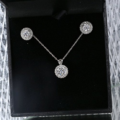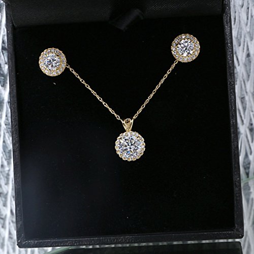 -. Feature : This set includes a pendant necklace and earrings. All items in the set are made of solid 14k gold and cubic zirconia stones. The set is available in either yellow or white gold. / For the necklace: the weight of the pendant is 0.9g, the 18" necklace weighs 1.5g, the diameter of the pendant is 9mm, the diameter of the center stone is 7mm (1.28ct), the length of the bale is 5mm, the chain is 0.85mm thick and either 15, 16, 18, 20, or 22 inches long. / For the earrings: Earrings are 7.7 mm wide. Central stone measures 4.5 mm. Total carat weight: 1.00 ct. / Comes with a gift box and free shipping.