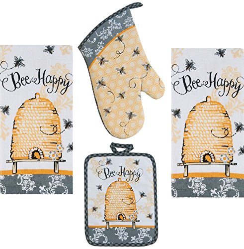 - "Bee Happy" coordinating set includes 2 terrycloth towels, 1 oven mitt, and 1 potholder; all 100% cotton