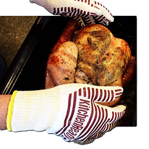 - Oven mitt with design on front and gray checkerboard quilted back side; measures 12 inches long