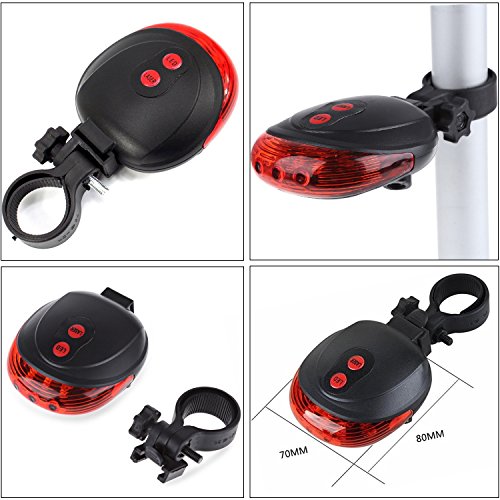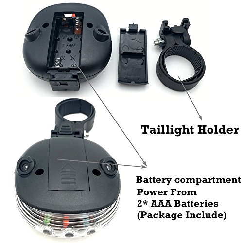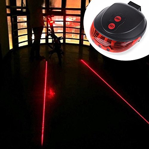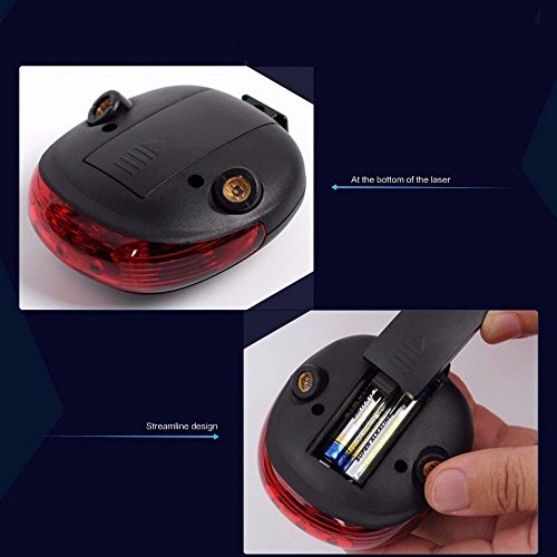 -. Feature : ✔【ULTRA BRIGHT AND COOL GIFT 】- Super bright 5 LED Lamp 2 Laser has 260 degree wider visibility and more conspicuous 2 laser around your bike, helping to protect and keep you safe .It is so cool and kids most love it / ✔【POWERED BY BATTERY 】- Powered by: 2 AAA batteries (Batteries Included), The laser bike light works for up to 36 hours, You don't need to worry about lack of power with a spear battery.DON'T WAIT, GET YOURS TODAY! / ✔【7 MODES TO CHOOSE 】- Always bright, flash, slow flash, left to right, right to left and left to right slow flash, flash, flash back and forth Light, Flashing modes changing by pushing the LED button, satisfied your needs in different situation / ✔【EASY TO INSTALL- WATERPROOF】 -NO TOOLS REQUIRED Crtch bicycle light installs in under 5 seconds. Doesn't matter what bike you're riding, we've got you covered! IPX-2 Water resistant rated protected against,tilt 15 degrees Anti-rainwater . But it can not dive! / ✔【HIGH QUALITY ANDGREAT WARRANTY SERVICE】- 100% SATISFACTION GUARANTEE -This bike light is protected by the high density special designed waterproof plastic lamp body, also there is a anti-slip silicon back base make your bike more secure. We provide a 24-month guarantee and great customer service.