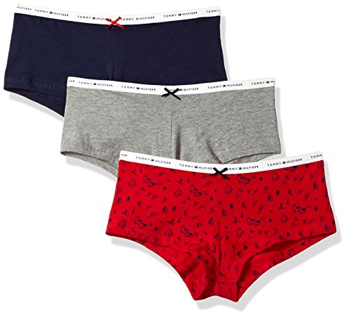 Tommy Hilfiger Women's 3pk Classic Cotton Logoband Boyshort, Trees/Skiers Tango Red/Peacoat/Heather Grey, L