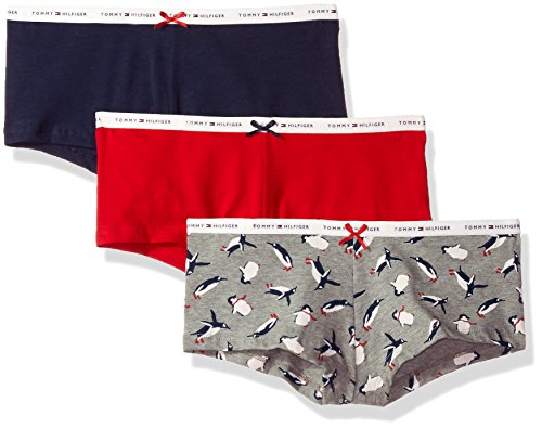 Tommy Hilfiger Women's 3pk Classic Cotton Logoband Boyshort, Penguins Toss Heather Grey/Tango Red/Peacoat, L
